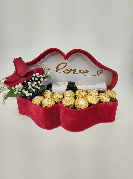 Caixa delicada com 01 mini espumante, 01 caixa de ferrero rocher aberta e arranjo de 01 rosa colombiana,  ruscos, tango, gypsophila (mosquitinho).